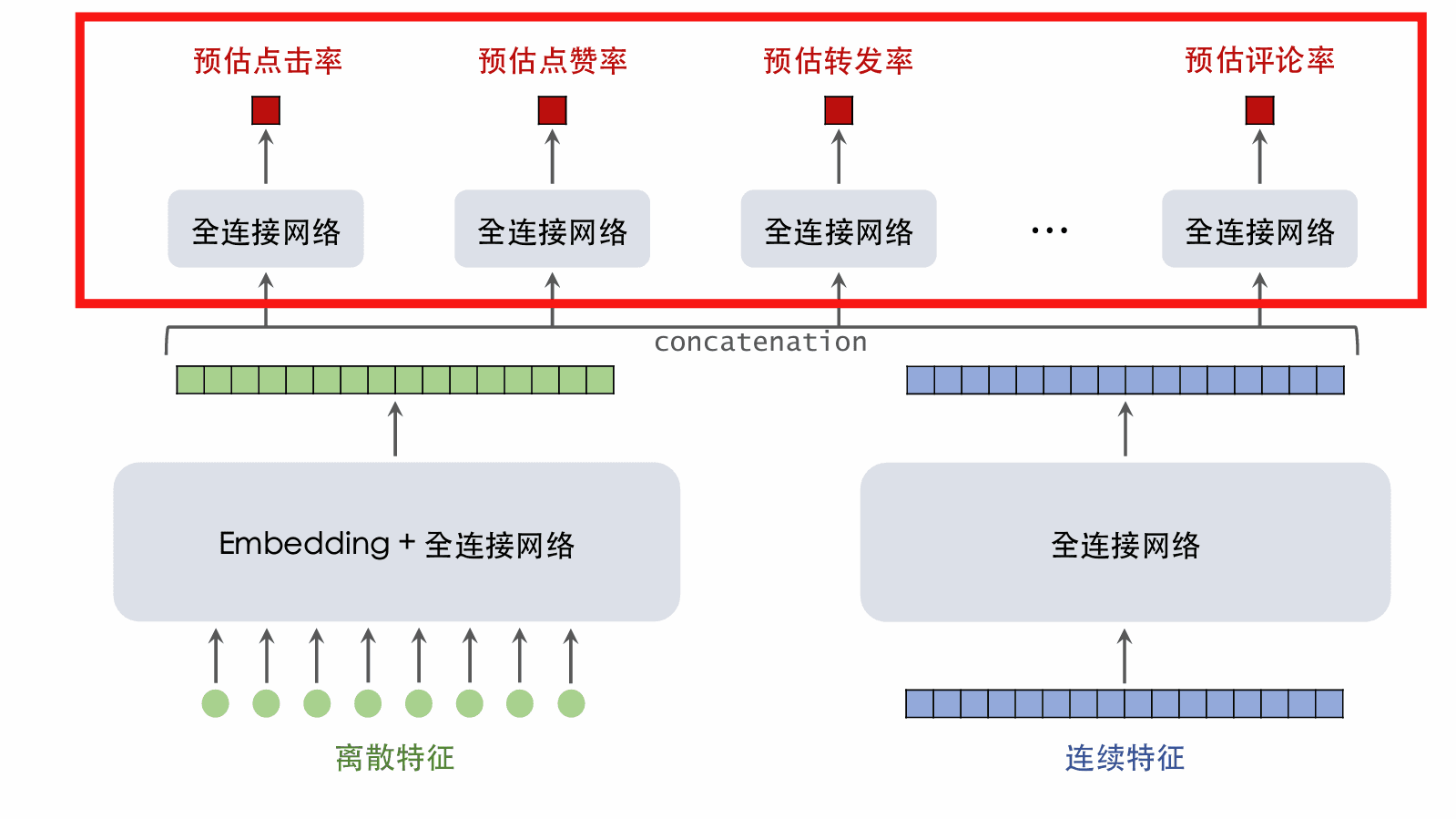 • 基座的输入包括离散特征和连续特征,输出一个向量,作为多目标预估的输入。