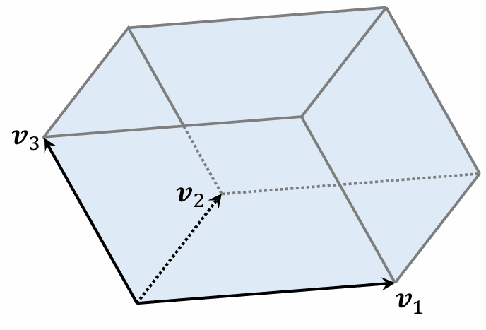 如果 线性相关,则体积 。(例:有 个向量,落在一个平面上,则平行六面体的体积为 0。)